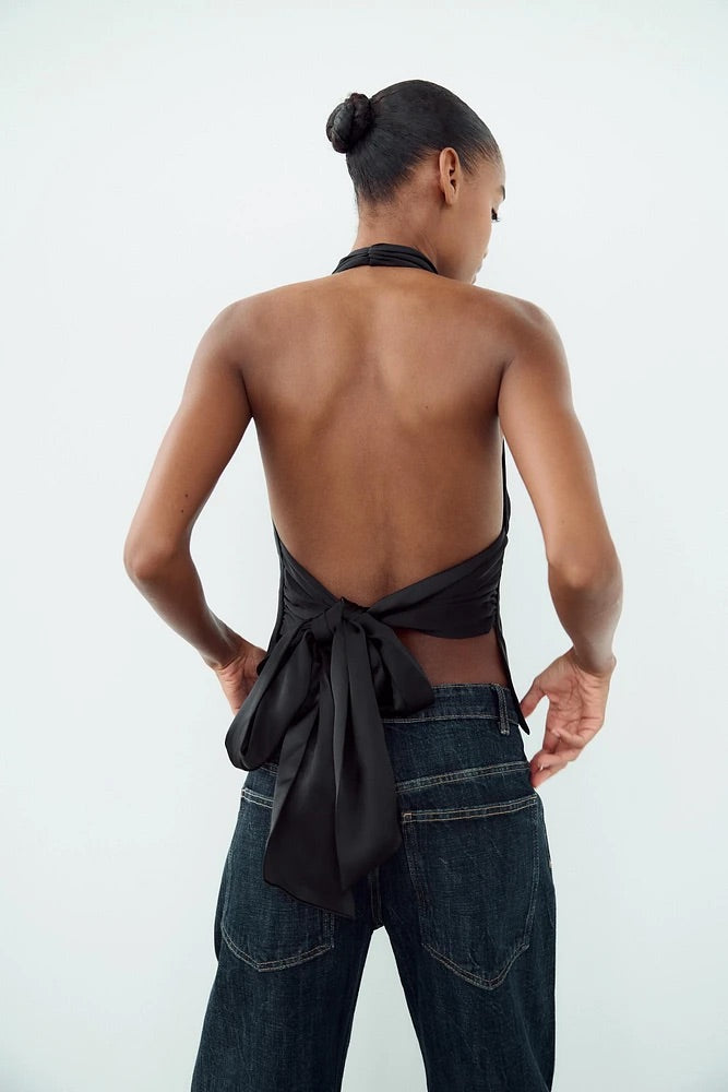 Turn heads with the effortlessly refined Satin Halter Top. Crafted from smooth, high-shine satin, this elevated piece features a structured high neckline and a dramatic open back finished with an oversized bow tie for a touch of feminine flair. Perfect for pairing with tailored trousers or denim, it’s your go-to for evenings out, date nights, or anytime you want to make a sleek, stylish statement.
