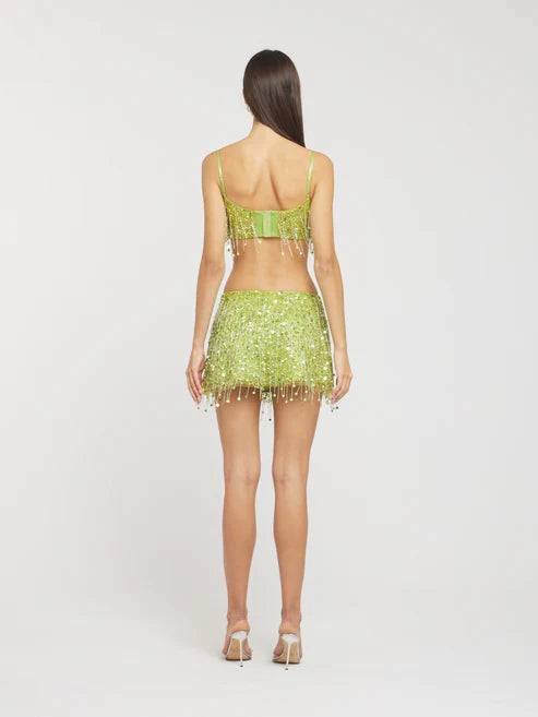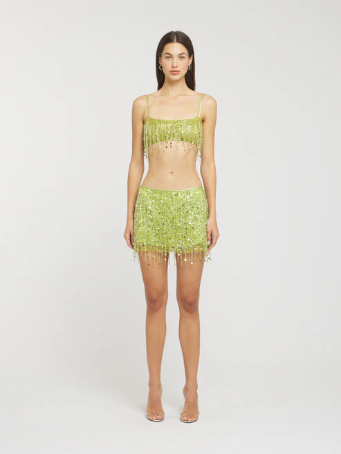 The Yasmin Hand Beaded Set is a showstopper designed for the bold and the glamorous. Featuring a dazzling crop top and matching mini skirt adorned with intricate hand-beaded fringe, this set catches the light with every move. Perfect for festival nights, beach parties, or any moment that calls for a little extra sparkle.
